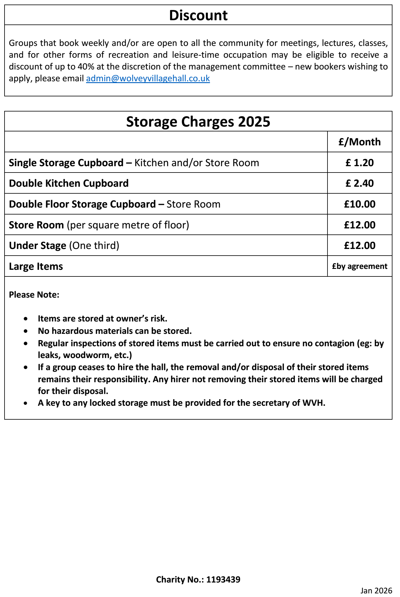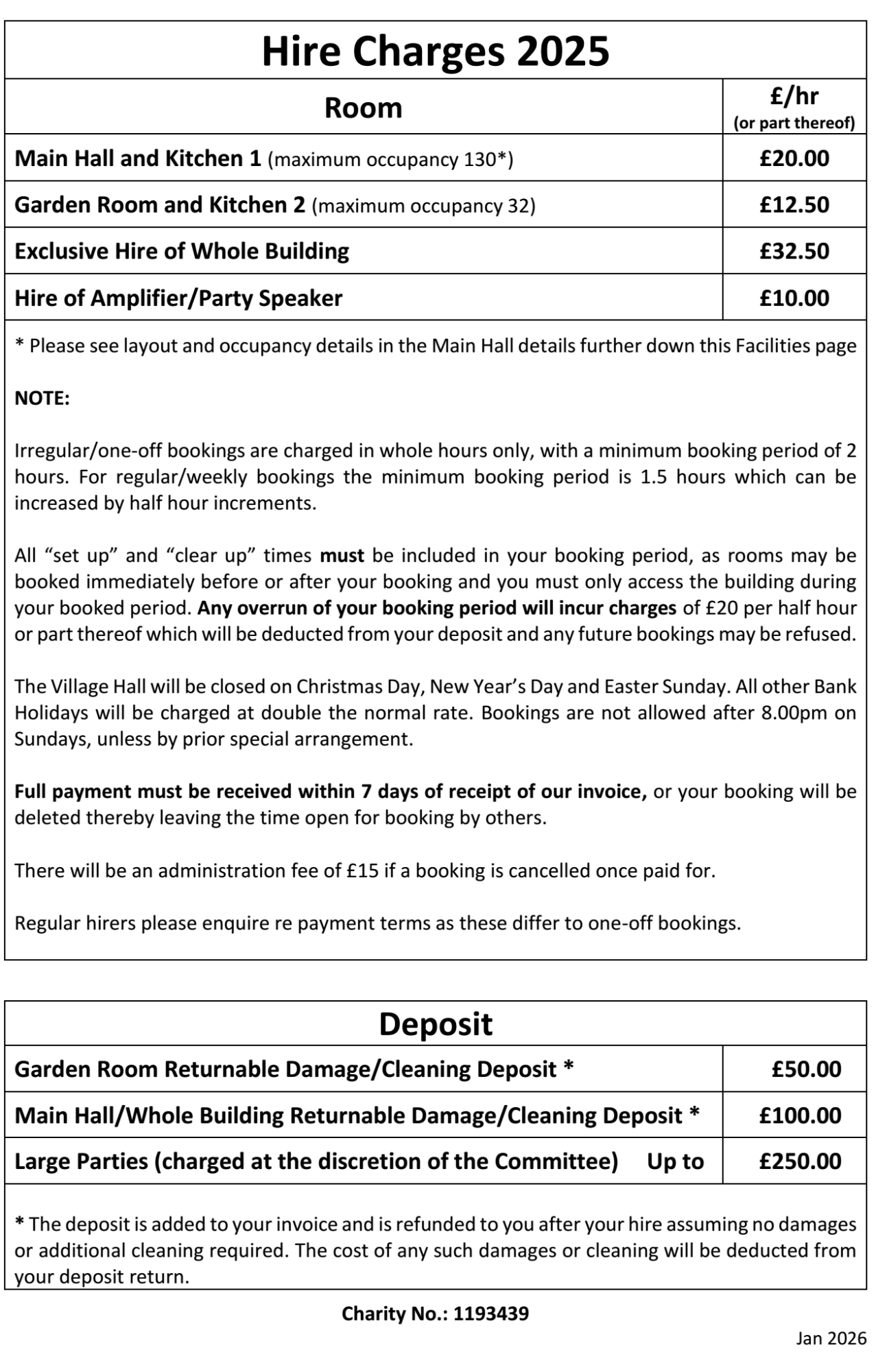 SCROLL DOWN FOR HIRE CHARGES, TERMS AND DETAILS OF OUR FACILITIES