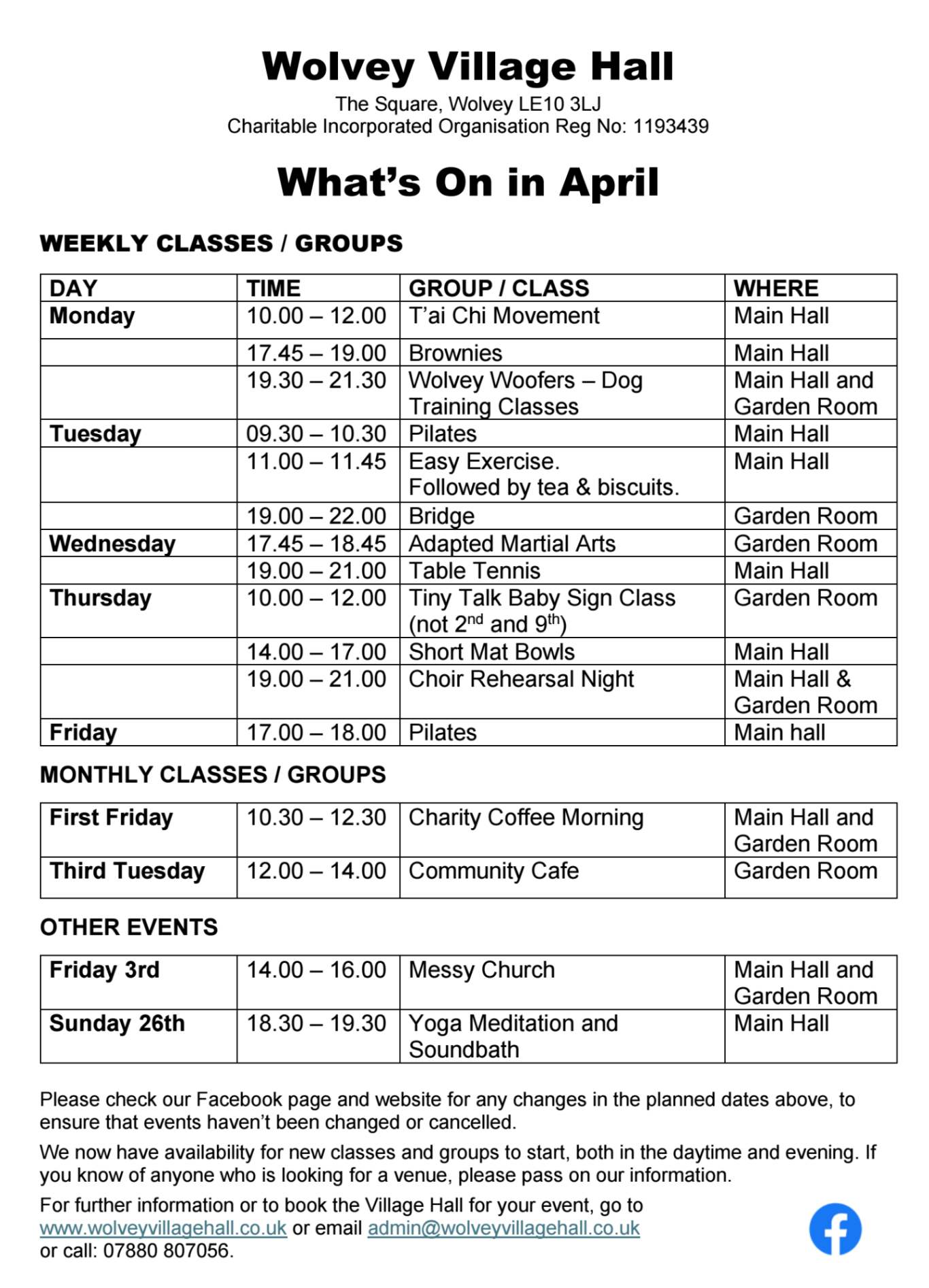 We are always looking for more volunteers to help with the running of the hall so please do get in touch if you'd like to be more involved in Wolvey village life!